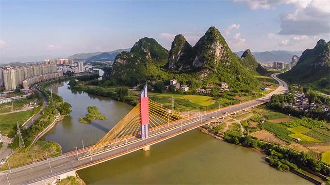 賀州市靈峰大橋工程位于八步區(qū)賀江一橋下游0.9公里處,北岸接靈峰北路,是連接賀江兩岸、緩解城市交通壓力、方便居民的重要通道之一。靈峰大橋設(shè)計(jì)全長為465.018米,其中南引道長50.448米,北引道長80.570米,引道全長131.018米,橋梁長度為334米,橋面寬度27米,按雙向四車道設(shè)計(jì)。主橋采用獨(dú)塔單索面預(yù)應(yīng)力混凝土展翅箱梁斜拉橋,邊跨跨徑68米,主跨跨徑86米,全長154米。橋面以上塔高51米,全橋設(shè)計(jì)共有77根樁基、9個(gè)承臺(tái)、7個(gè)墩身、2個(gè)橋臺(tái)。