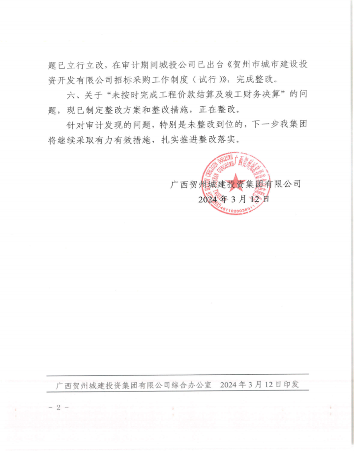 賀州市城市品質(zhì)提升改造工程財務(wù)收支及項目執(zhí)行情況審計整改情況公告
