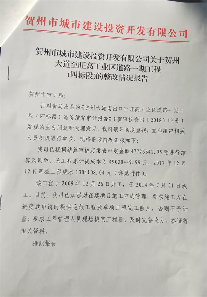 賀州市城市建設(shè)投資開發(fā)有限公司關(guān)于賀州市江南路網(wǎng)一期-江南路西段(1標(biāo))審計(jì)發(fā)現(xiàn)問題整改情況的報(bào)告 pdf