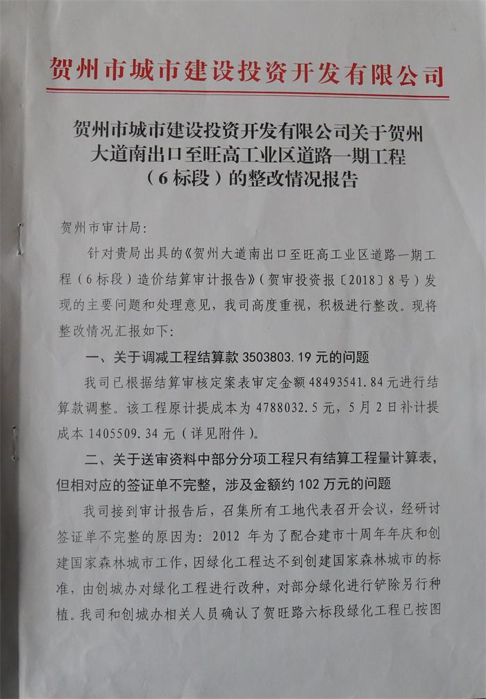 關于賀州大道南出口至旺高工業(yè)區(qū)道路一期工程(5標段)整改情況報告2018-07-13