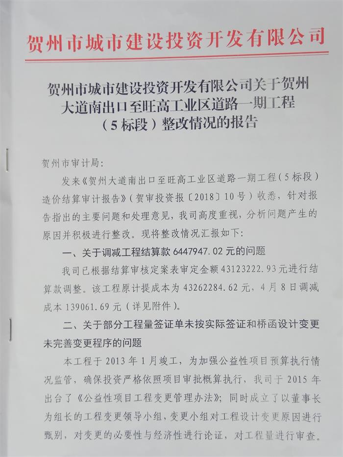 關于賀州市靈峰大橋工程建設項目竣工決算審計整改情況的報告2018-02-23